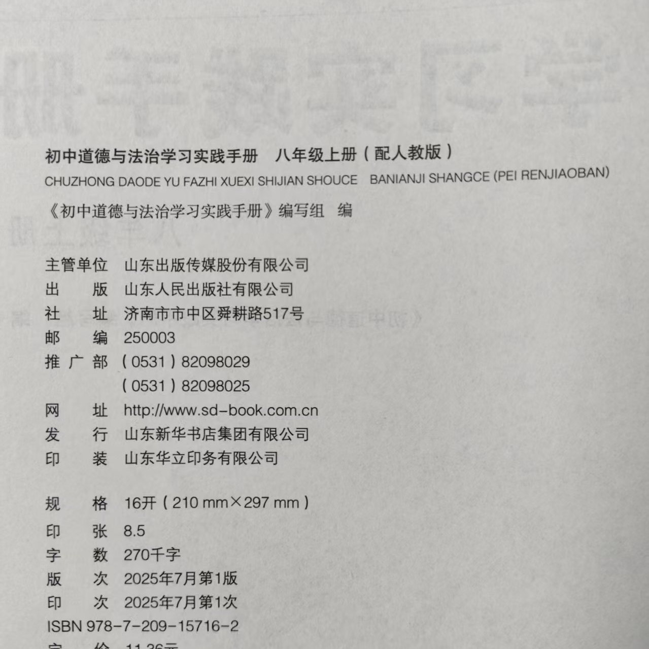 社初二8八年级道德与法治学习手册同步练习册上册配人教版 2025秋新版 六三制初中道德与法治学习实践手册八年级上册山东人民出版
