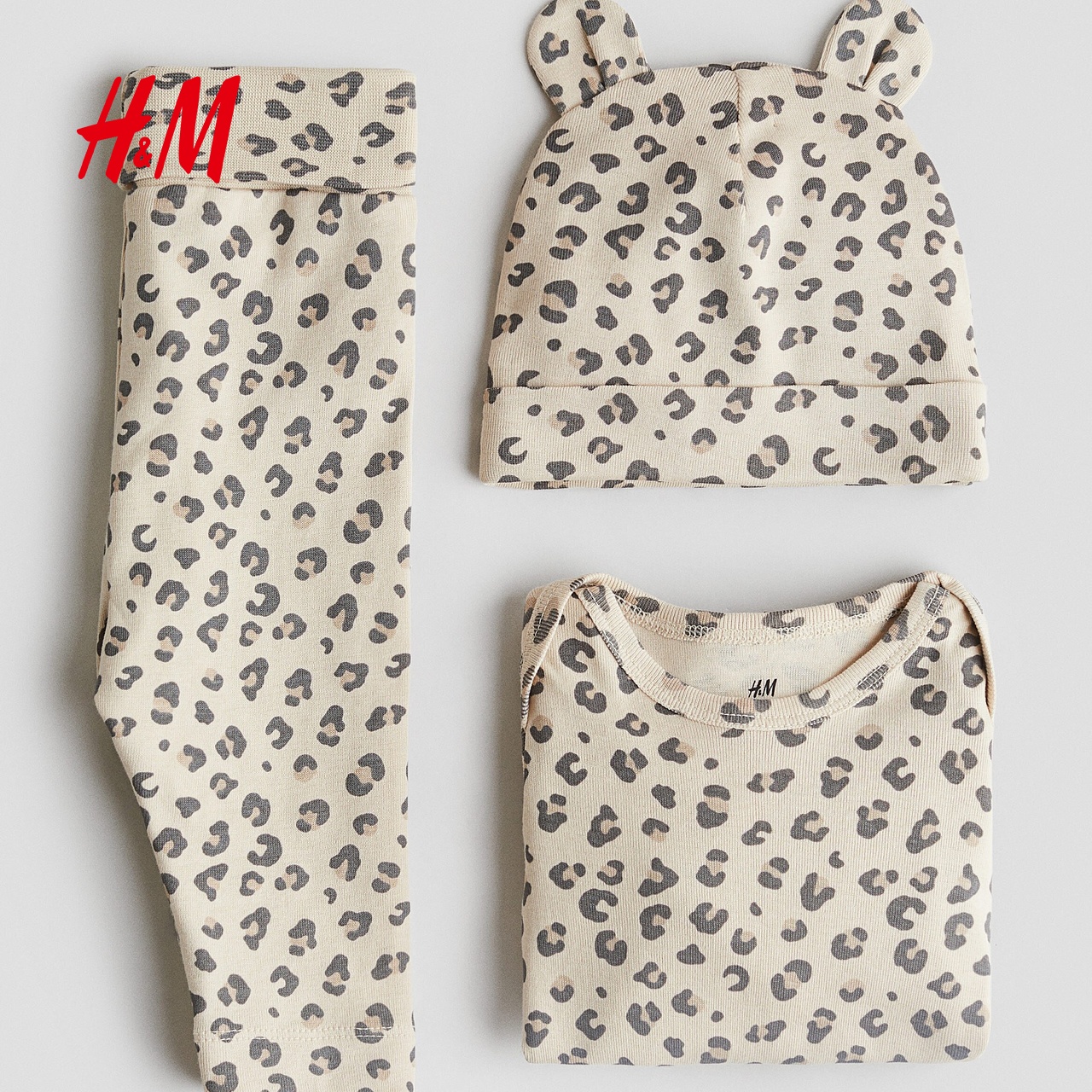 时髦洋气棉哈衣长裤 3件式 头箍0979605 新生儿男婴女婴套装 HM童装