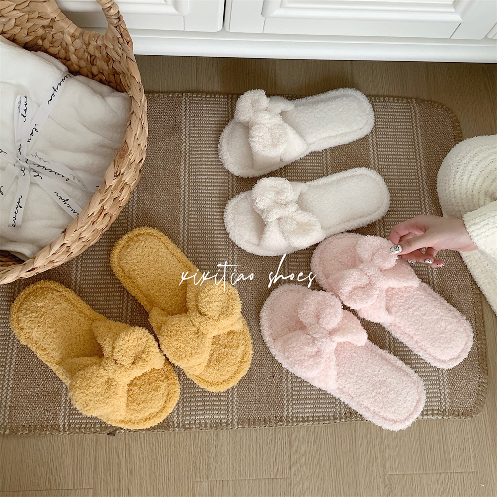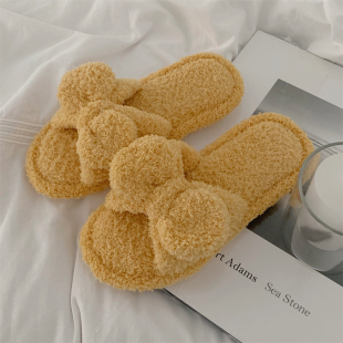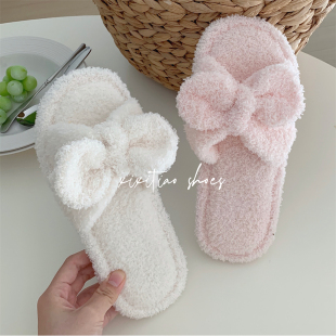居家防滑一字棉拖鞋 细细条温柔蝴蝶结毛毛拖鞋 女韩系网红秋冬季