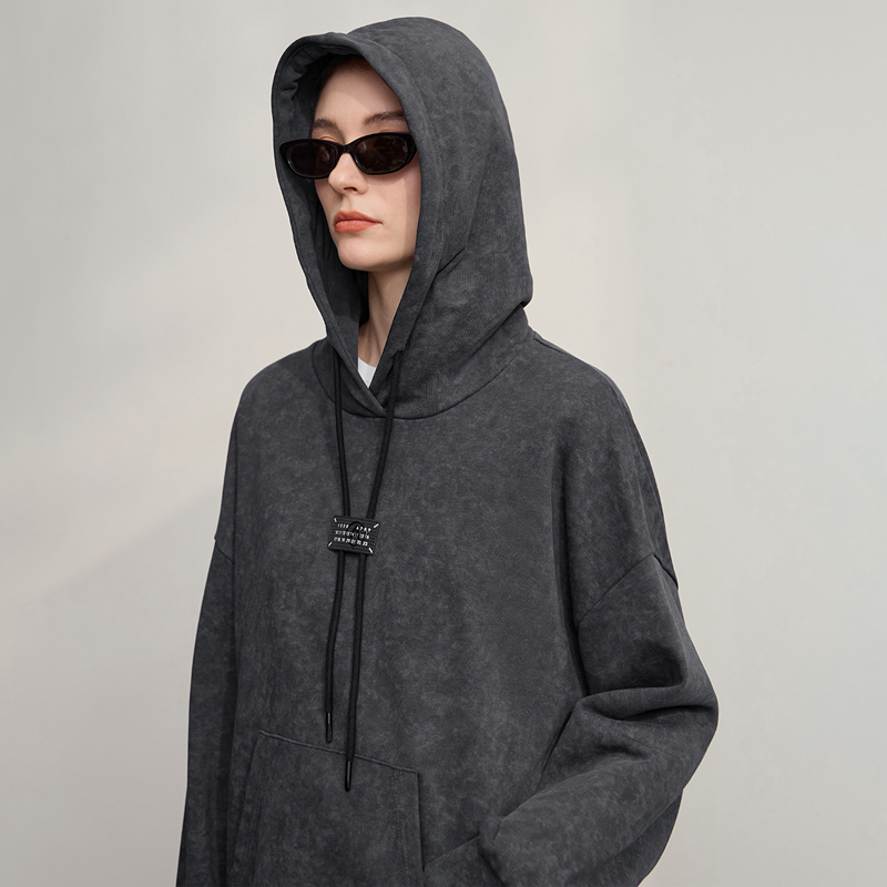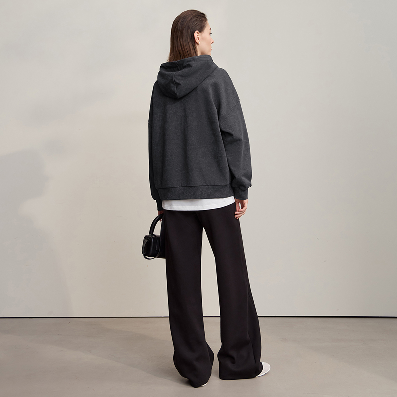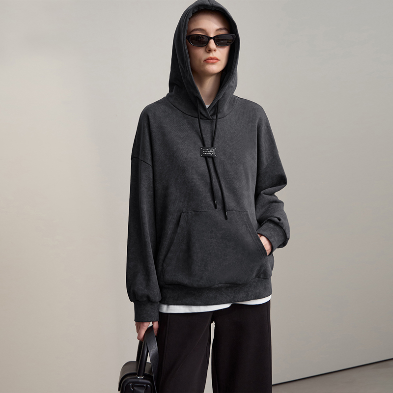 Amii2025秋新款 棉质上衣 晕染炒花数字标牌连帽卫衣女宽松落肩袖