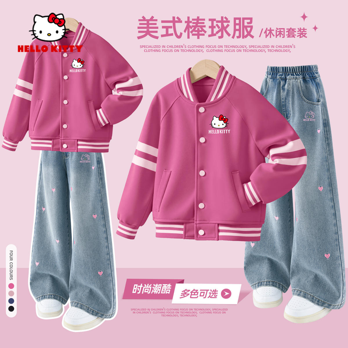 洋气运动儿童秋装 女大童牛仔裤 衣服 秋季 HelloKitty女童棒球服套装