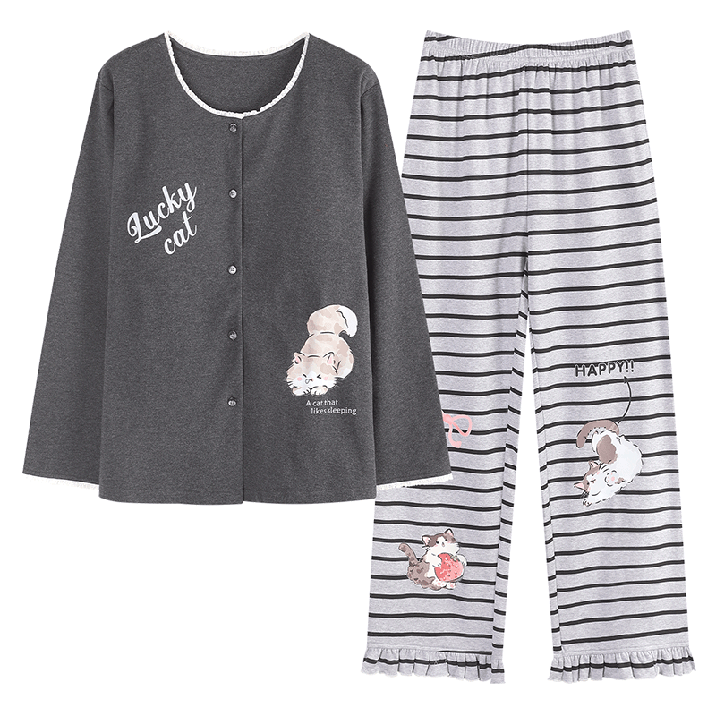 长裤 纯棉长袖 甜美可爱卡通印花家居服 春秋款 猫人带胸垫睡衣女套装