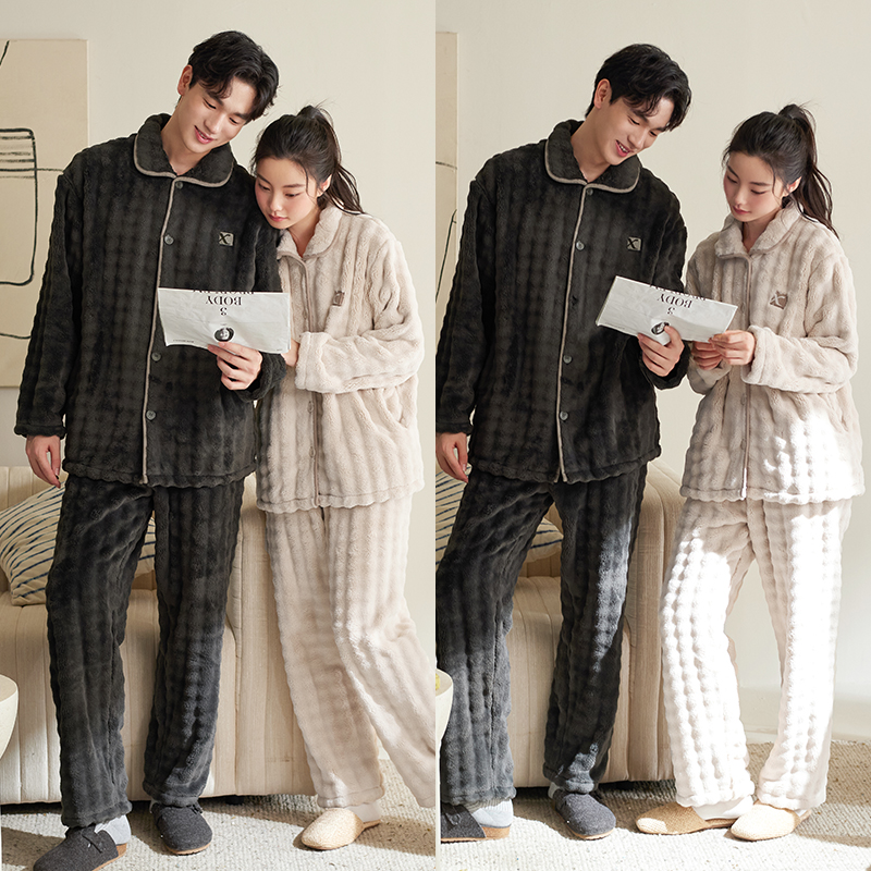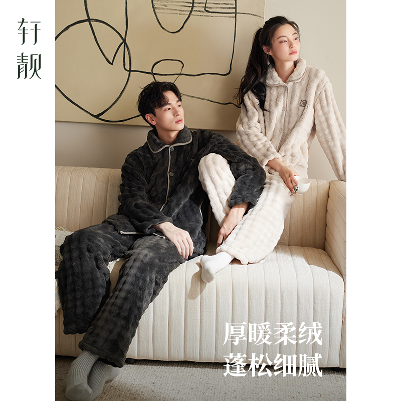 珊瑚绒加绒加厚男家居服套装 泡芙绒情侣睡衣女冬季 抗静电 轩靓