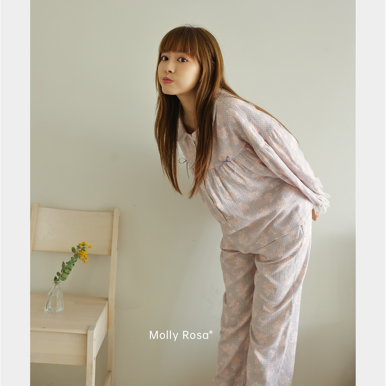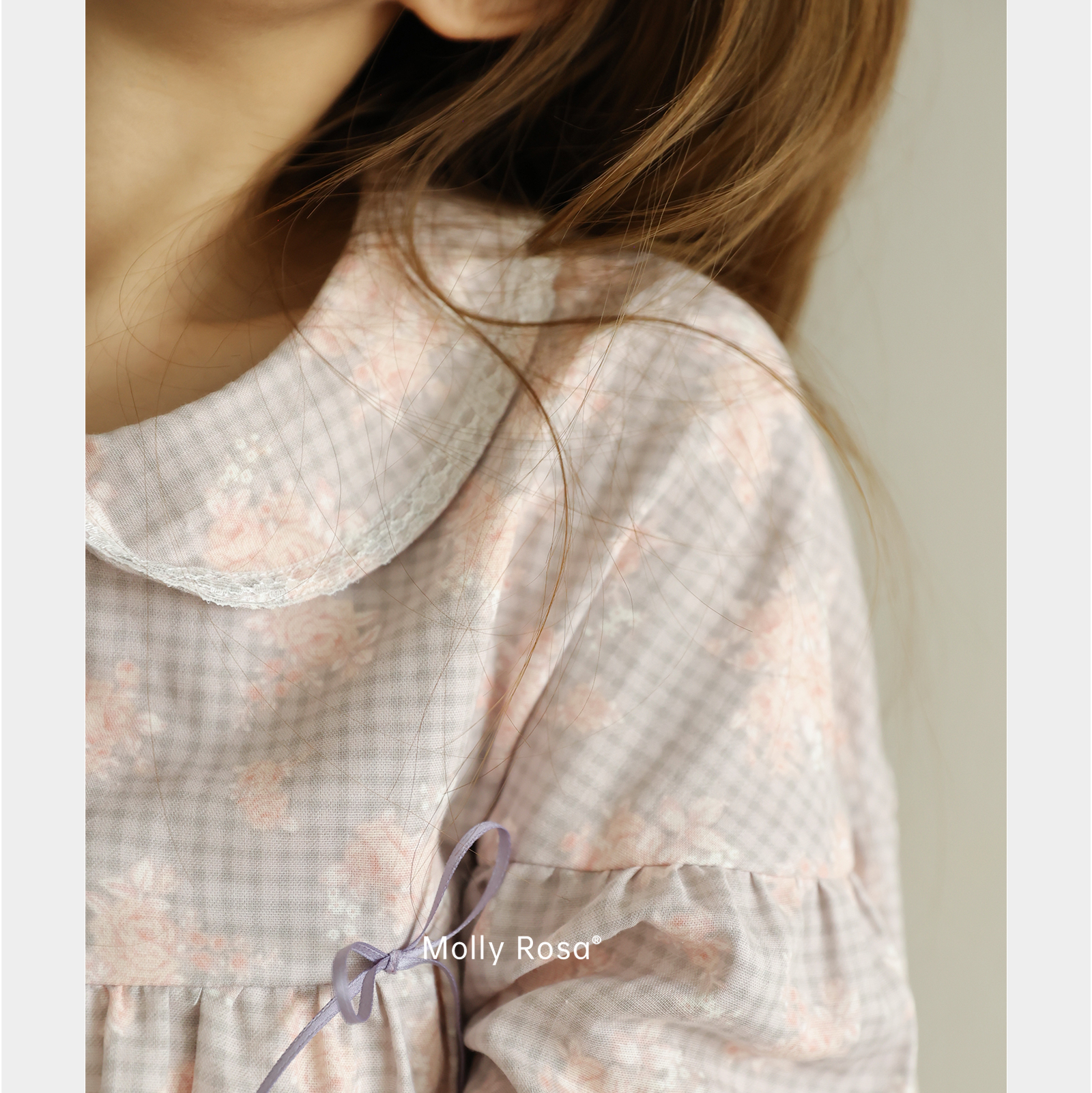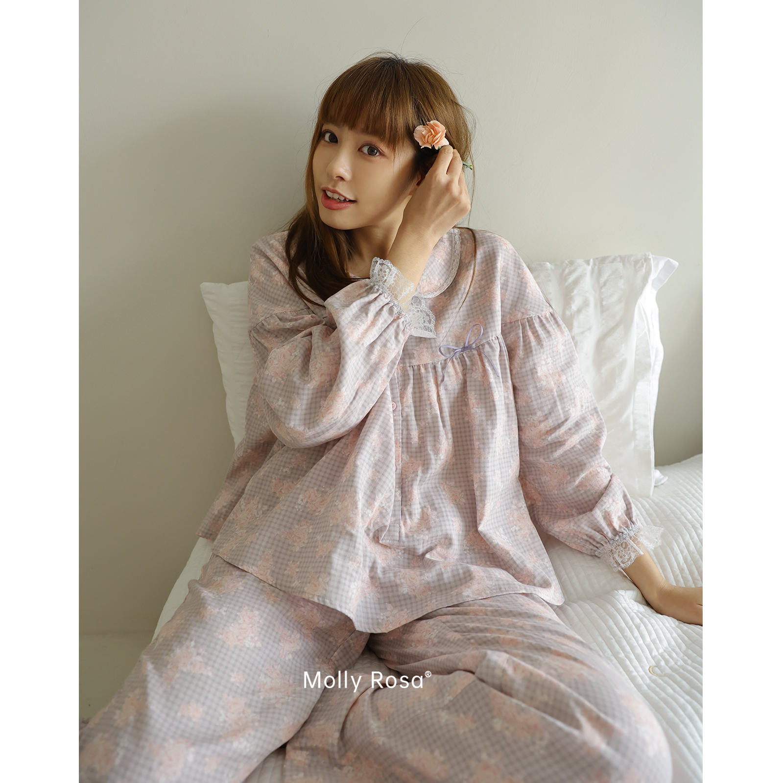新 睡衣家居服套装 MollyRosa落野灰·长袖 纯棉双层纱碎花格子长裤