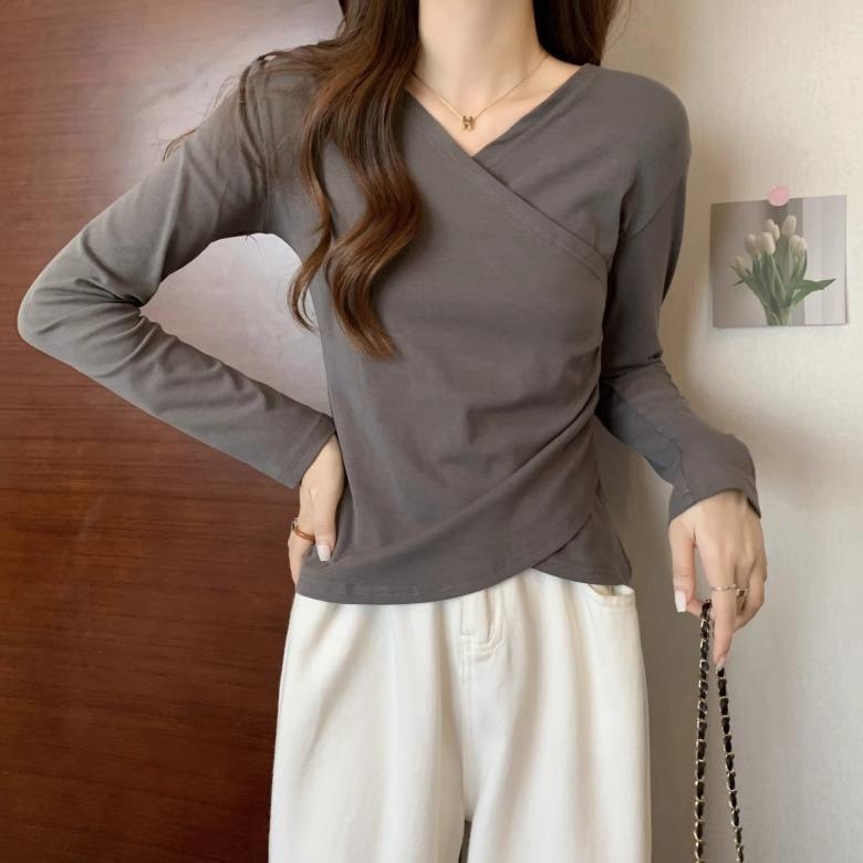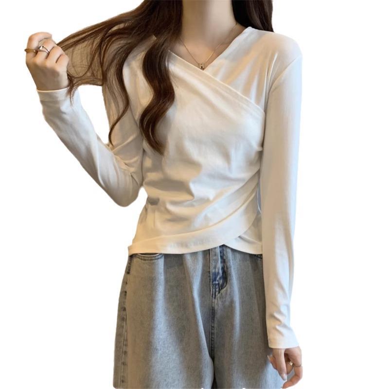 内搭打底衫 修身 显瘦不规1020n T恤女新款 秋冬女士打底白色V领长袖