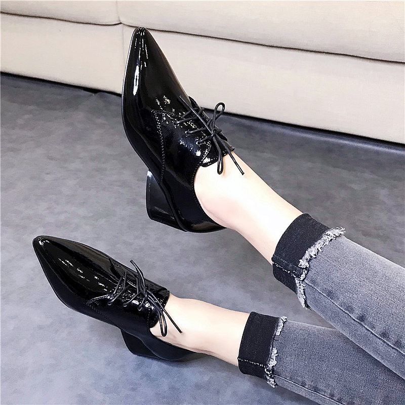 女鞋 系带小皮鞋 春款 尖头粗跟漆皮中跟春秋单鞋 女真皮 春季 2025新款