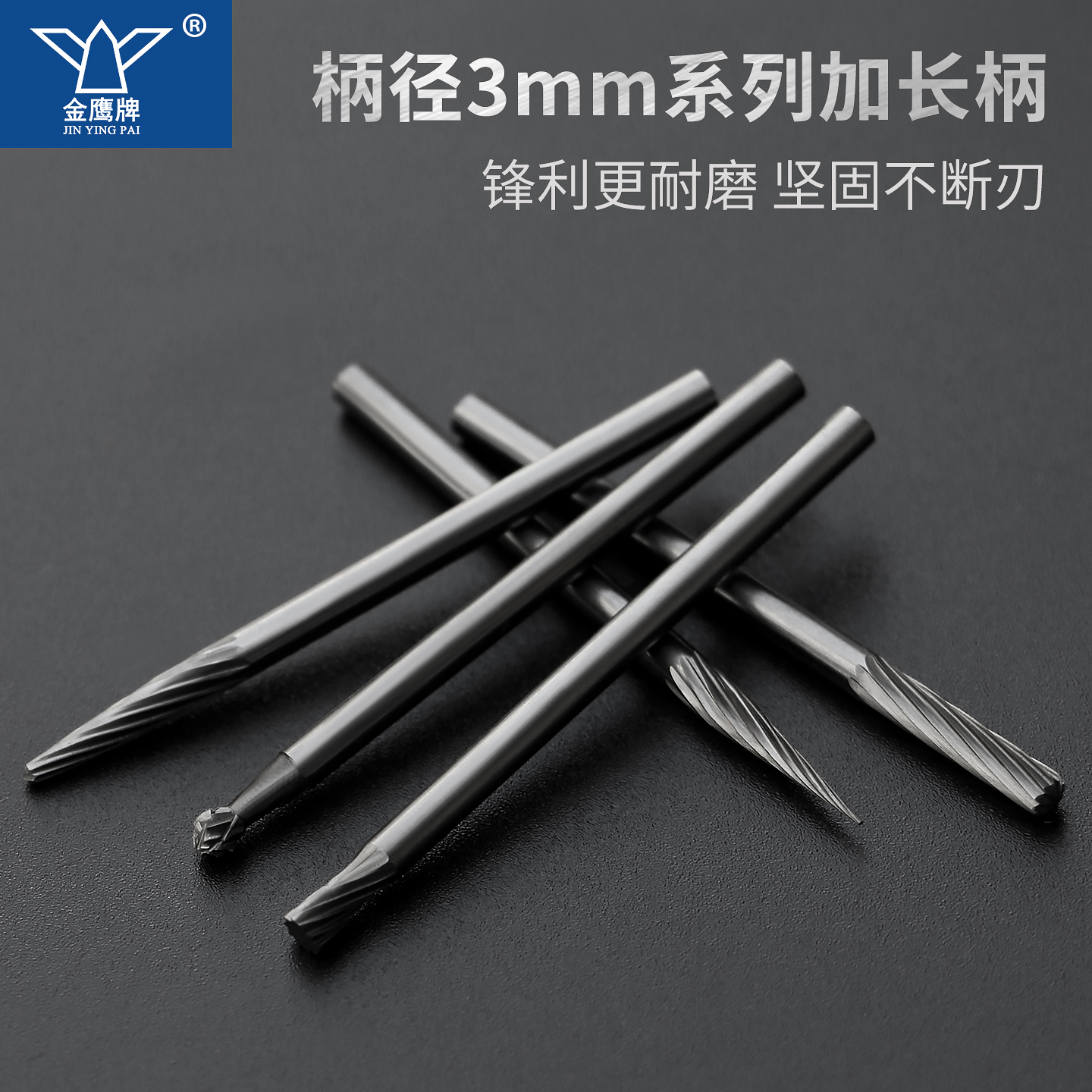 金鹰硬质合金旋转锉钨钢磨头金属铣刀加长柄刃径柄径3mm 总长50mm