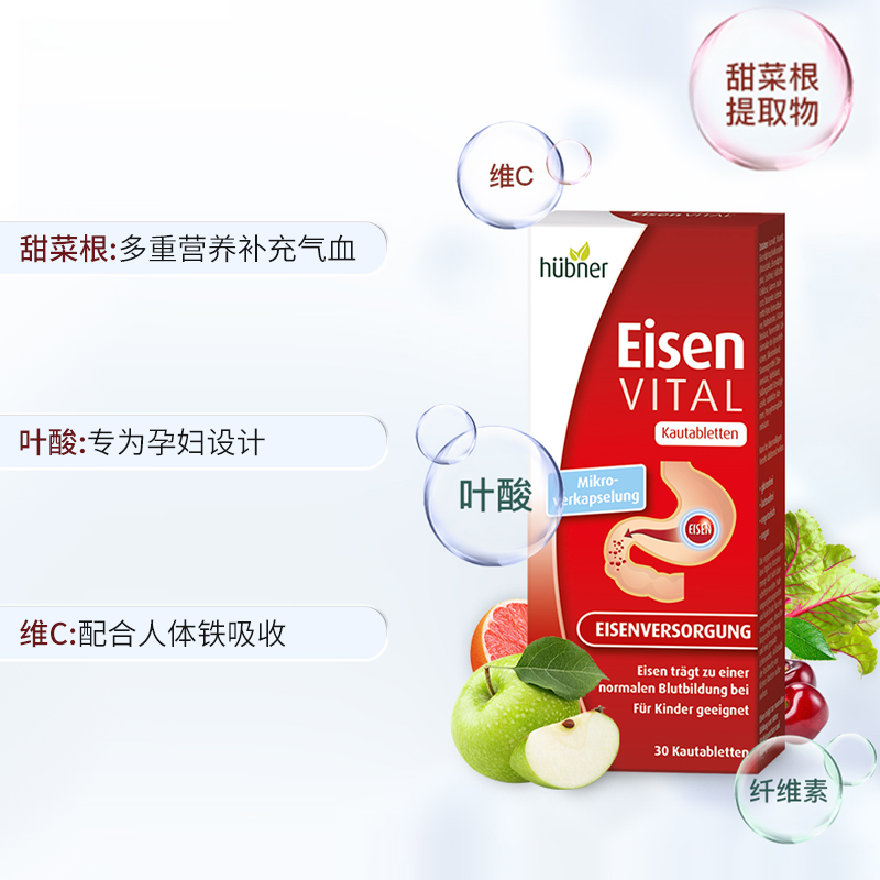 Huebner郝柏娜德国进口铁元 素铁片补铁女性孕产妇叶酸咀嚼片30片