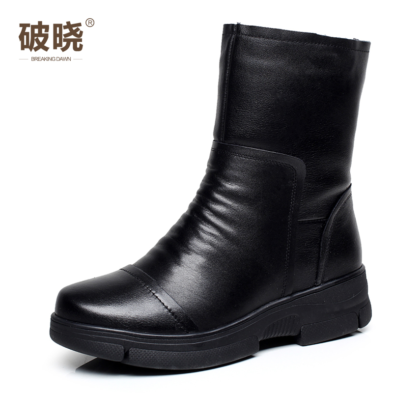 女平底短靴子松糕坡跟棉靴真皮短筒加绒大码 冬季 厚底中筒女靴棉鞋