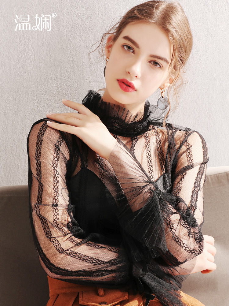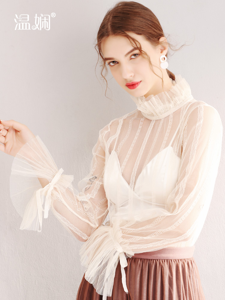 网纱仙气上衣 透视内搭纱衣薄纱透明喇叭袖 花边领蕾丝打底衫 女长袖