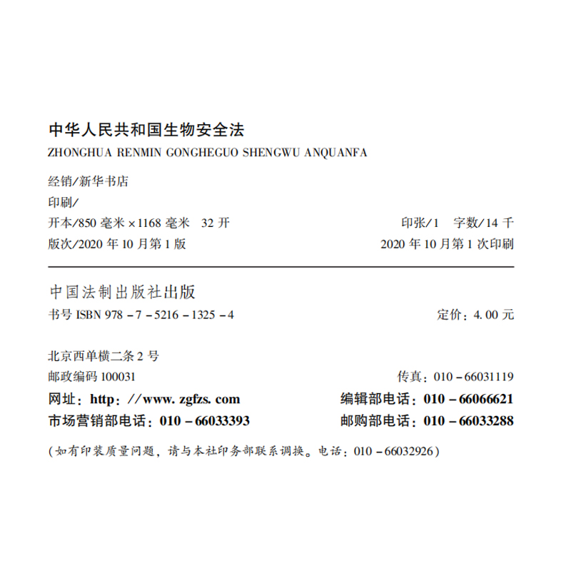 生物安全事件 社 中华人民共和国生物安全法 风险预防 保护生物多样性 法律法规法条 2020新书 32开 法制出版 正版 分类管理 现货