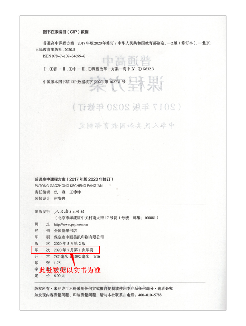 2017年版 2020年修订 2021年适用 正版 社 普通高中课程方案 人民教育出版 9787107346996 2020年新版