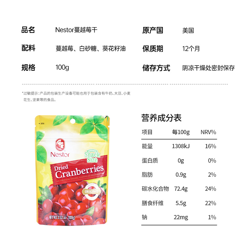 Nestor蔓越莓即食果干蜜饯饼干烘焙专用食材美国进口孕妇零食100g