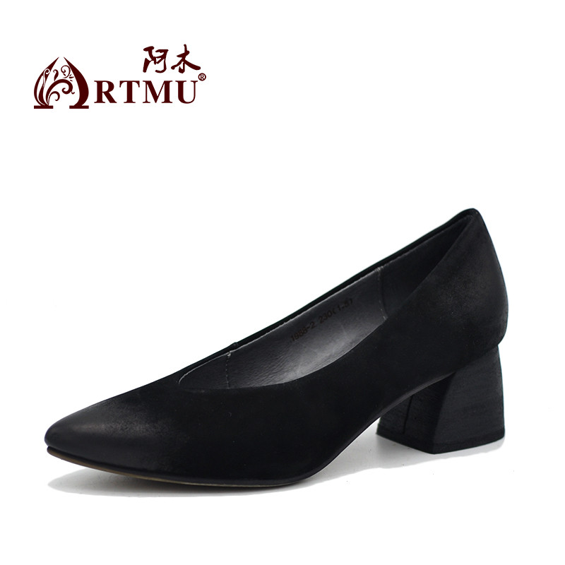 奶奶鞋 Artmu阿木新款 真皮女鞋 百黑色尖头工作鞋 浅口粗中跟单鞋