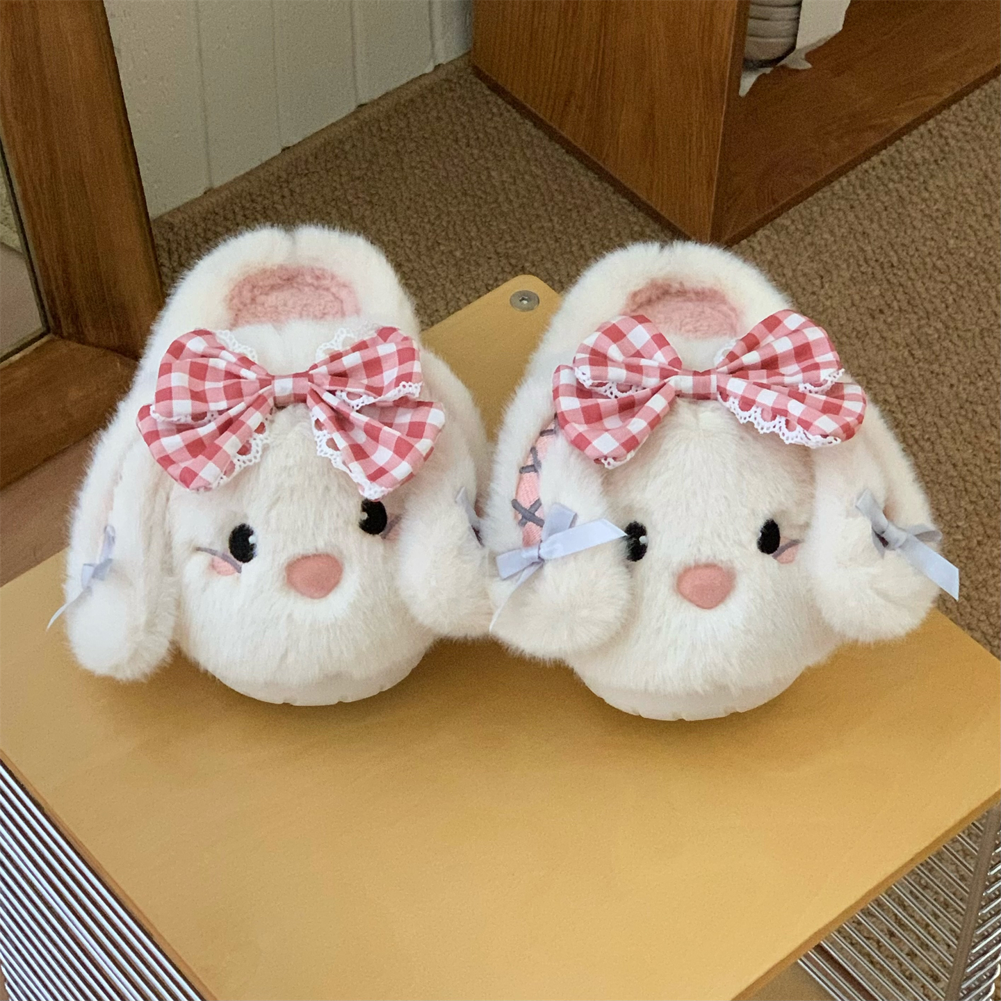 家用保暖甜美蝴蝶结兔子防滑毛毛鞋 女士 冬ins百搭休闲舒适棉拖鞋