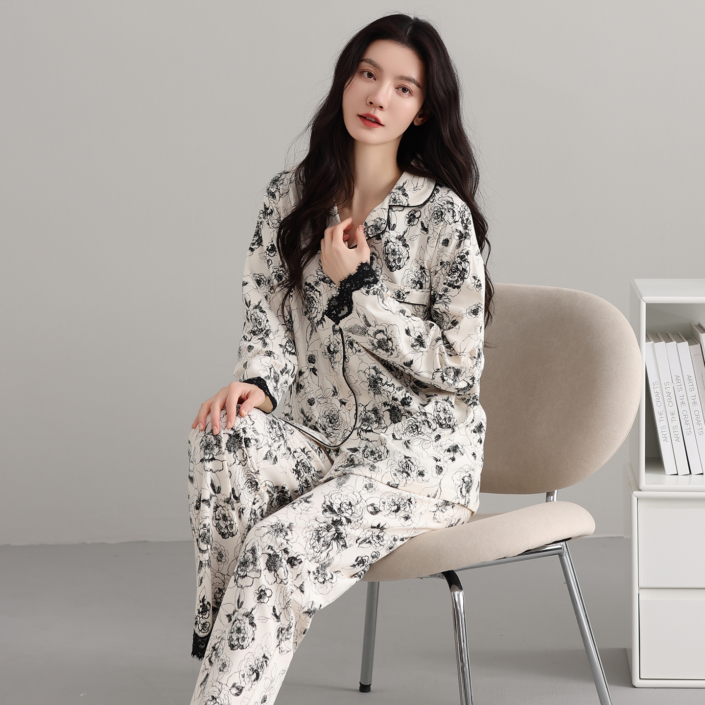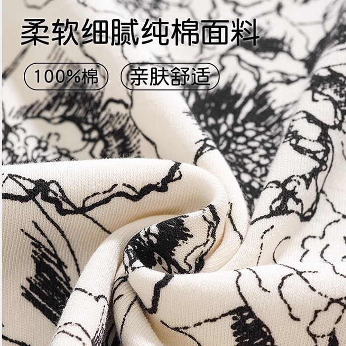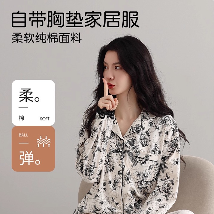 婷美纯棉睡衣女2025新款 带胸垫家居服 国风水墨花卉典雅秋冬款