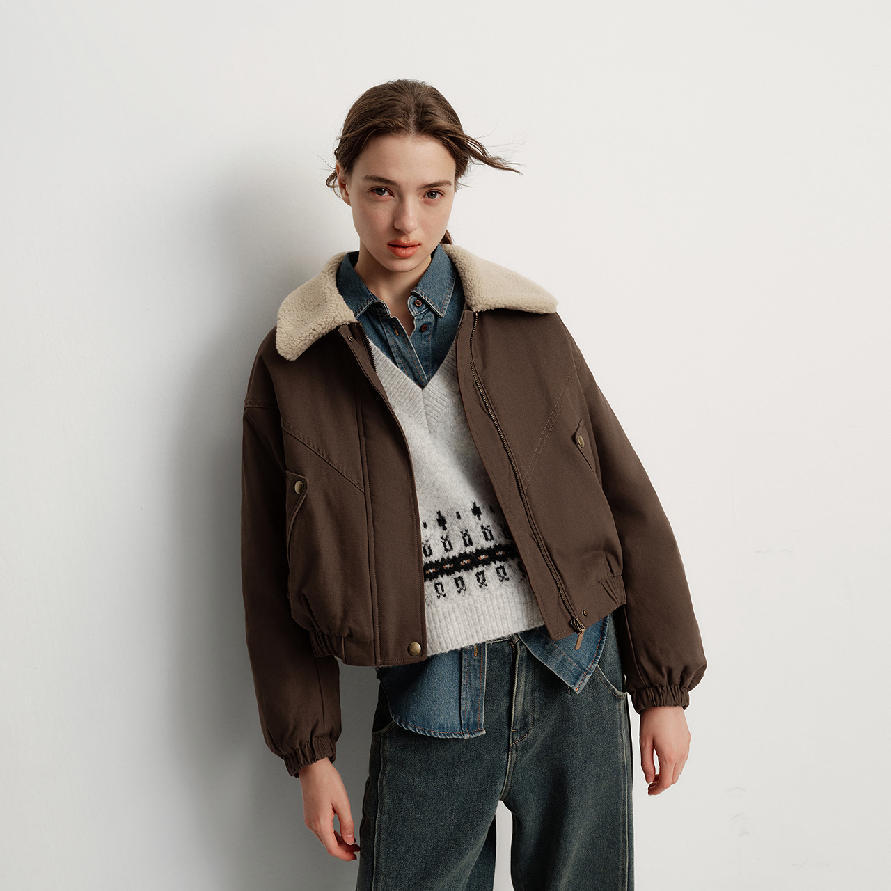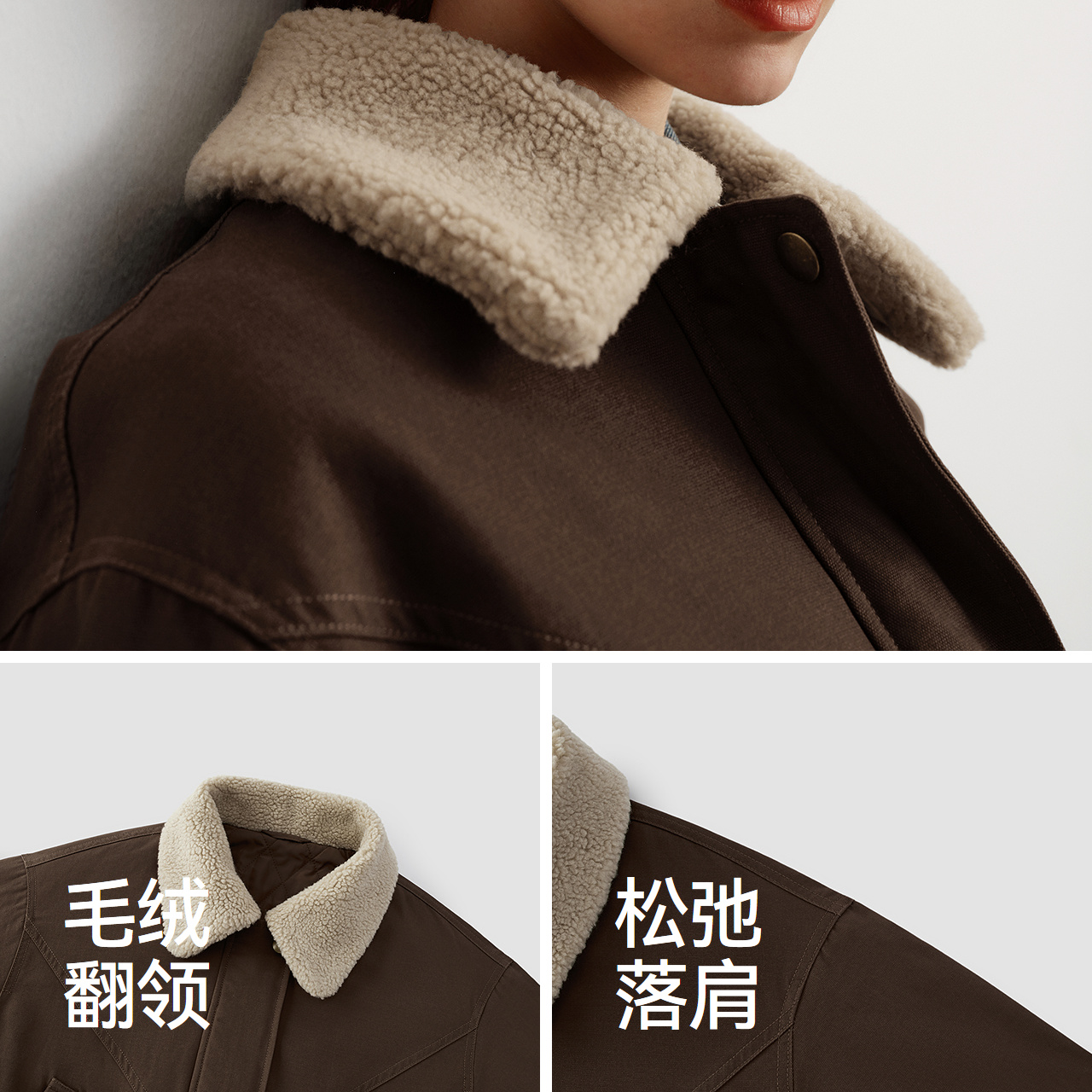 森马外套女冬季 巴恩风夹克 夹棉仿羊羔毛翻领oversize磨毛2025新款