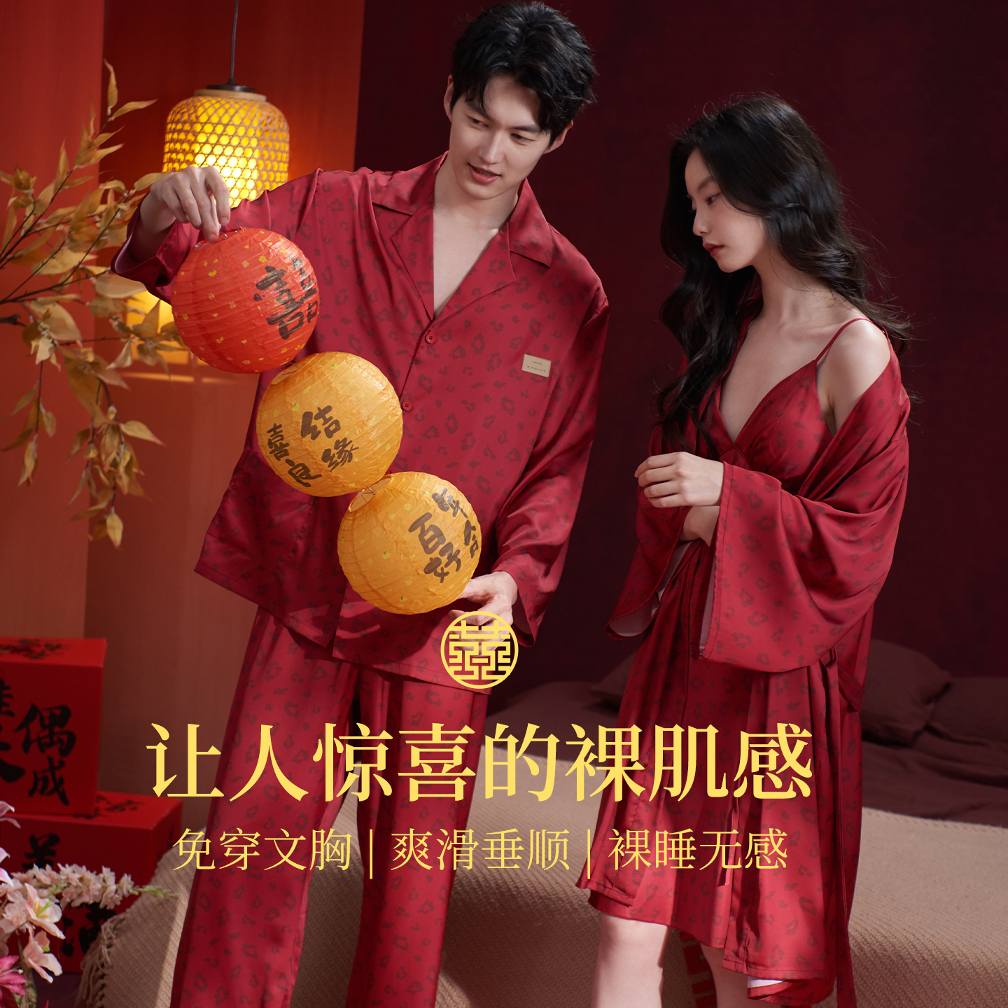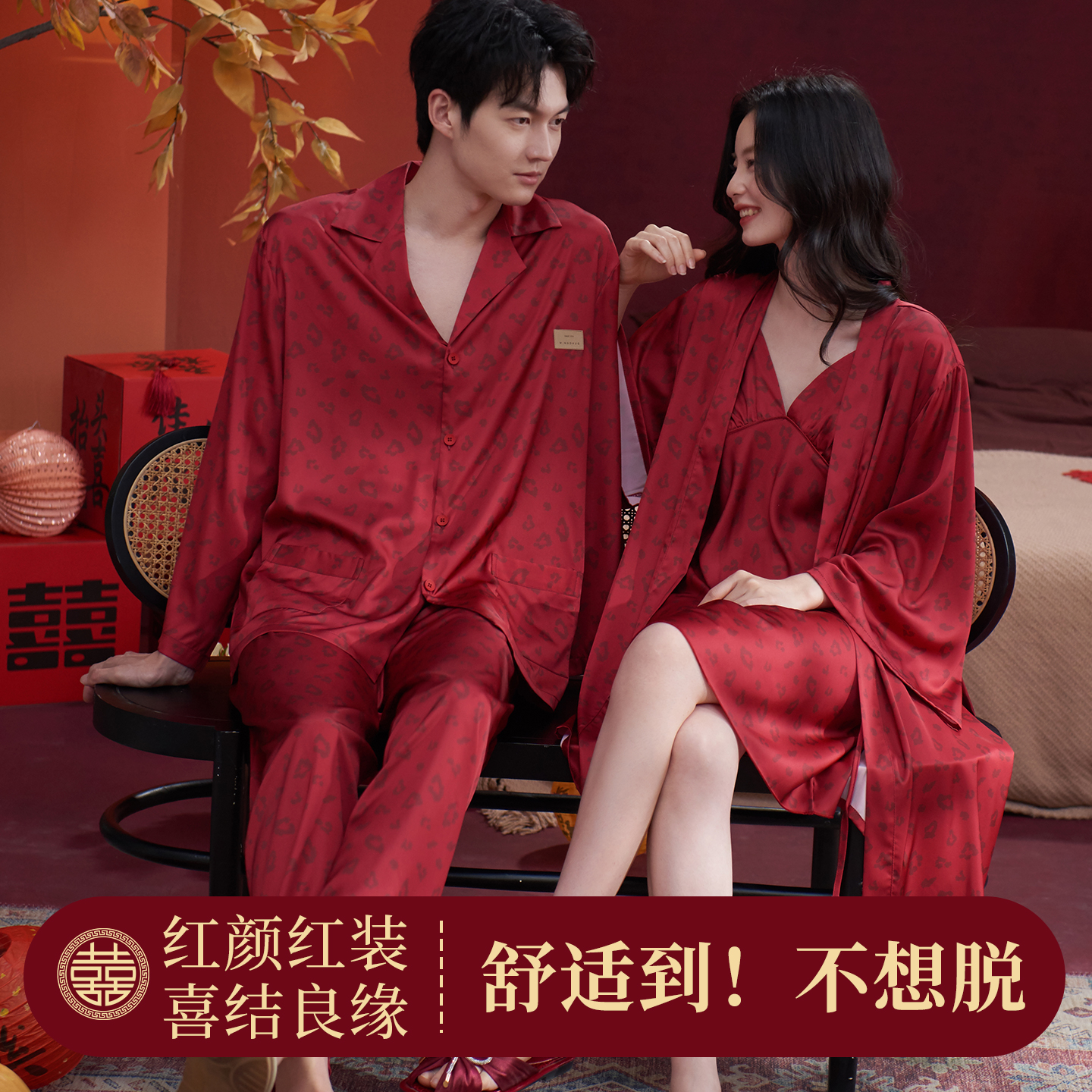 男士 乐姿梦情侣睡衣女春秋季 冰丝新娘晨袍红色新婚结婚家居服套装