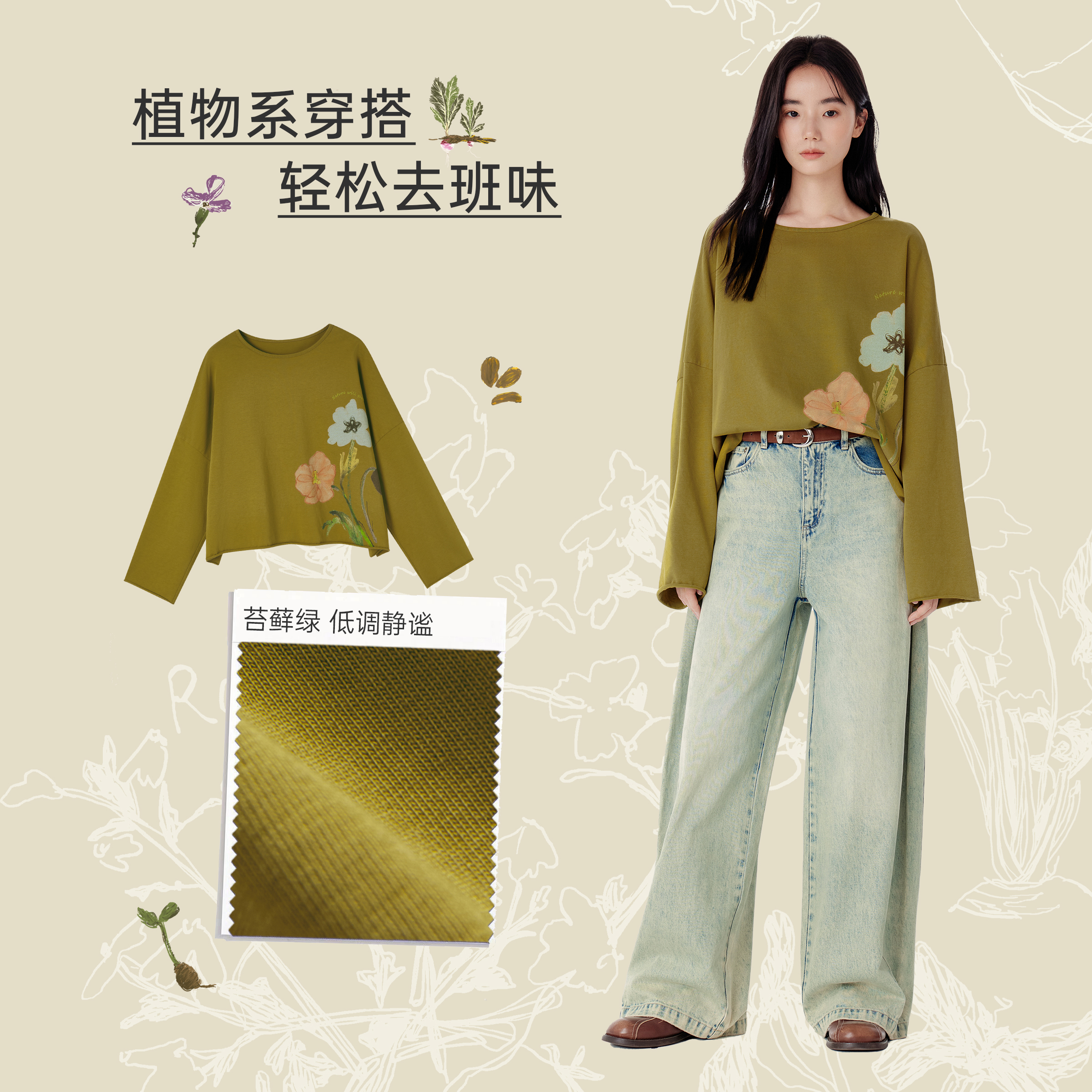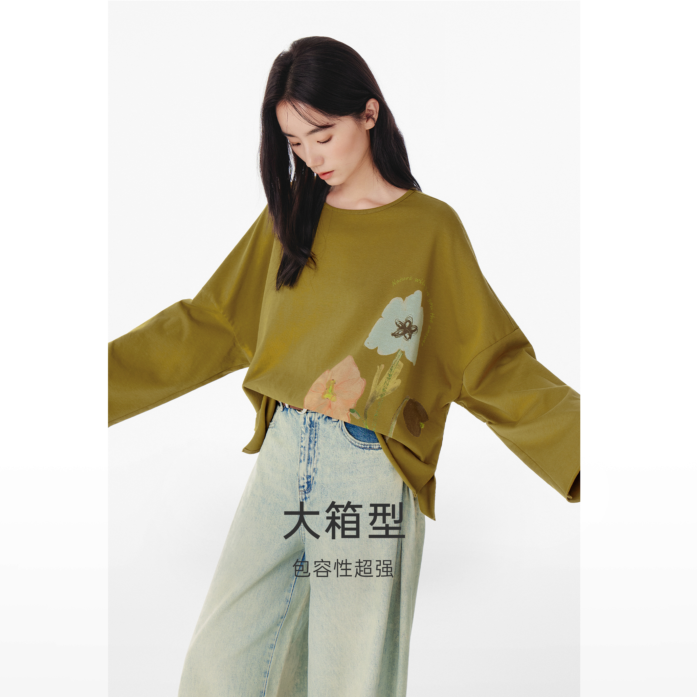 显瘦休闲纯棉上衣 T恤女2025秋新款 飞鸟和新酒落肩袖 廓形印花长袖