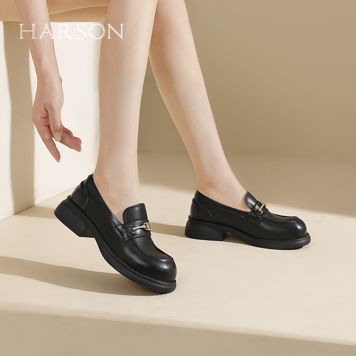 一脚蹬单鞋 真皮平底休闲乐福鞋 子 女2025新款 哈森复古英伦风小皮鞋