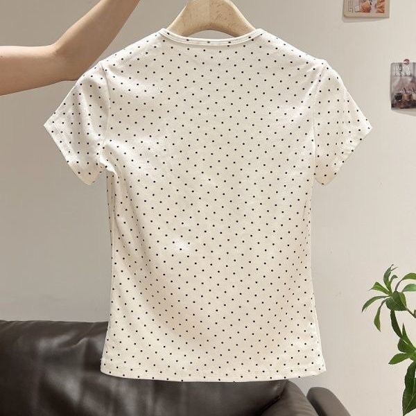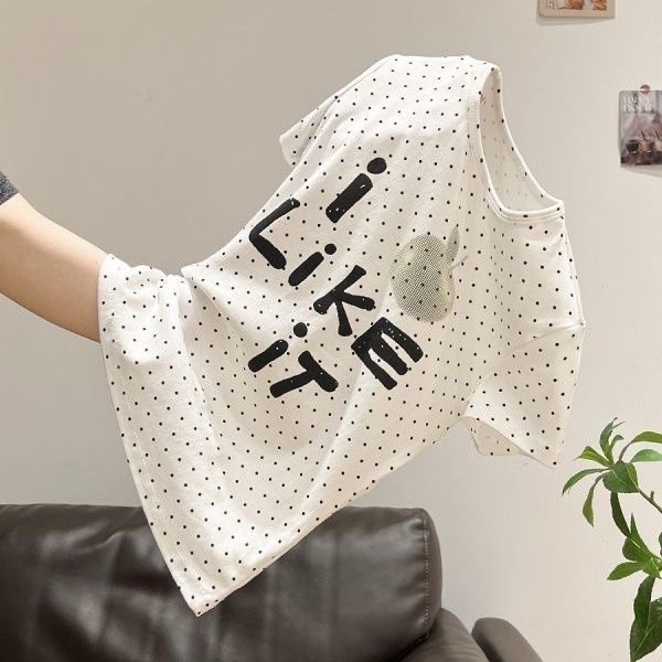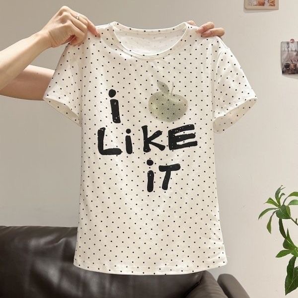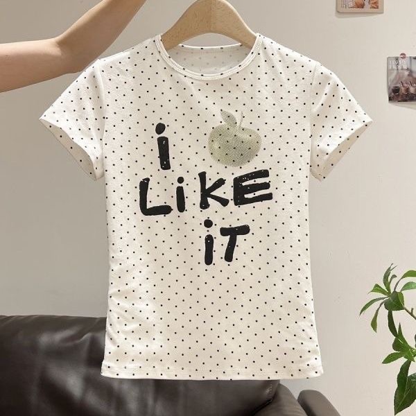 韩系正肩波点字母短袖 显瘦上衣 t恤女设计感青苹果印花甜辣妹修身