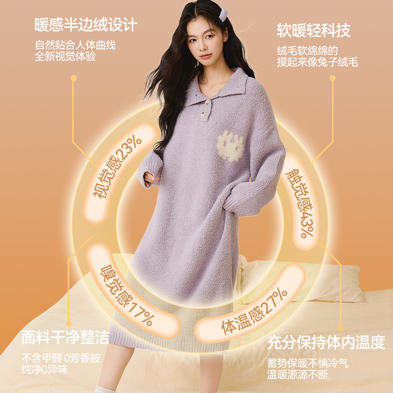 睡衣奶呼呼家居服 猫人半边绒睡裙女秋冬加厚保暖长袖 戚薇同款
