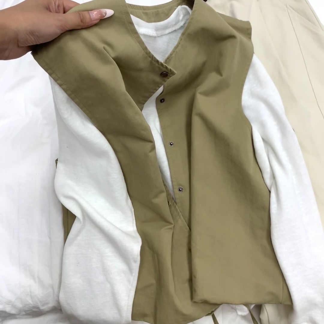 女 两件套ins秋季 韩系气质独特卡其色无袖 坎肩马夹外套内搭打底衫