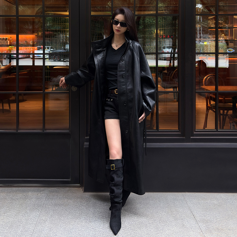 显瘦单排扣长袖 百搭宽松休闲皮衣外套韩版 上衣女口袋 新款 春秋季