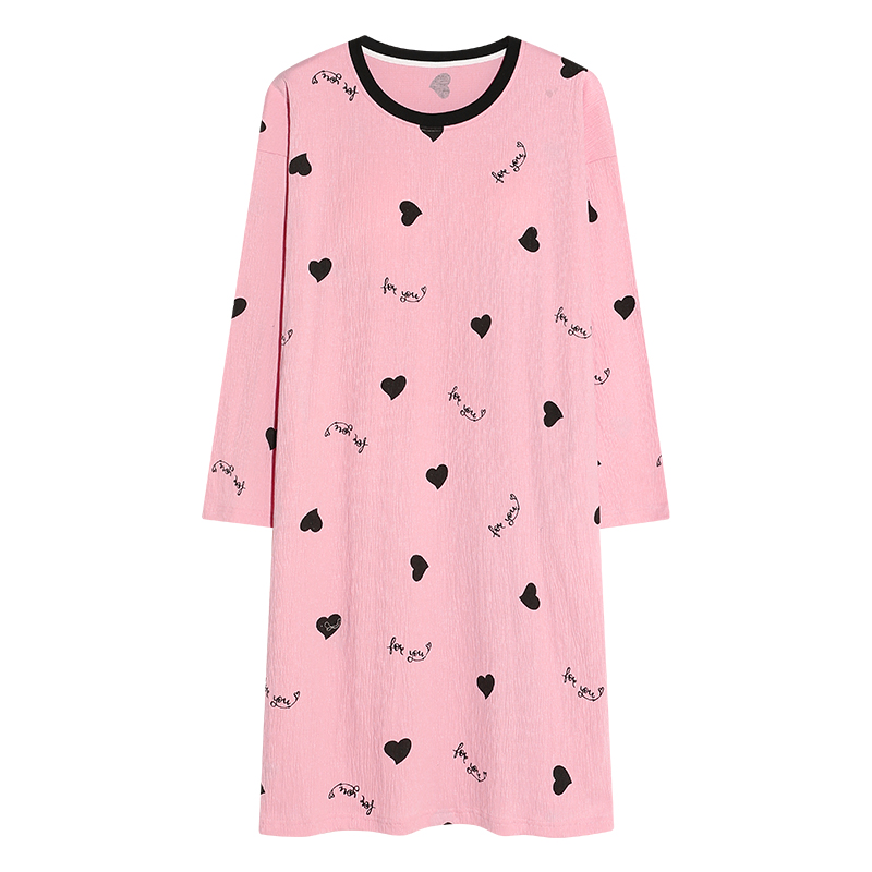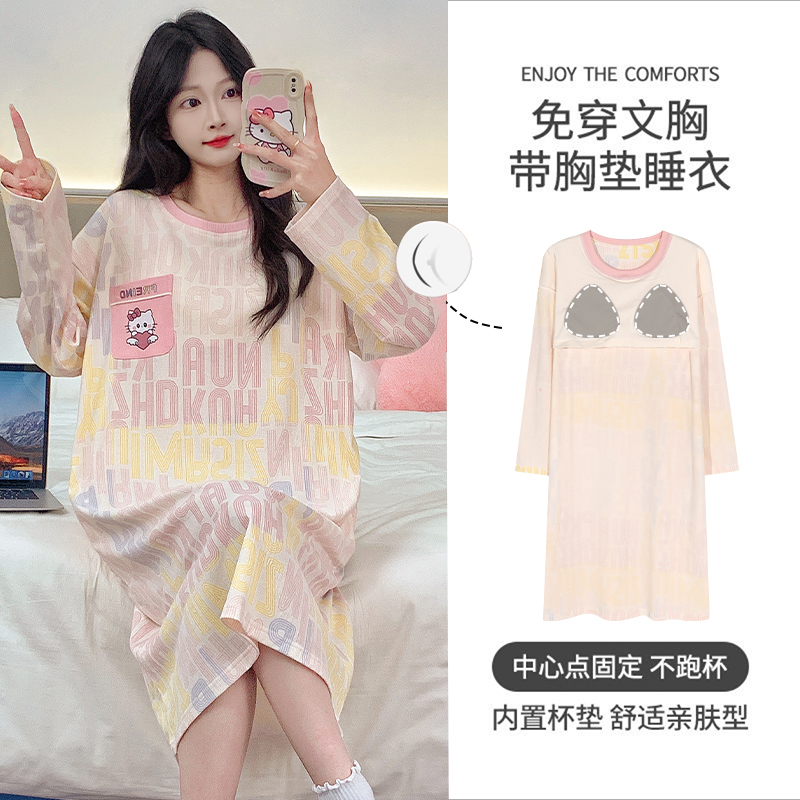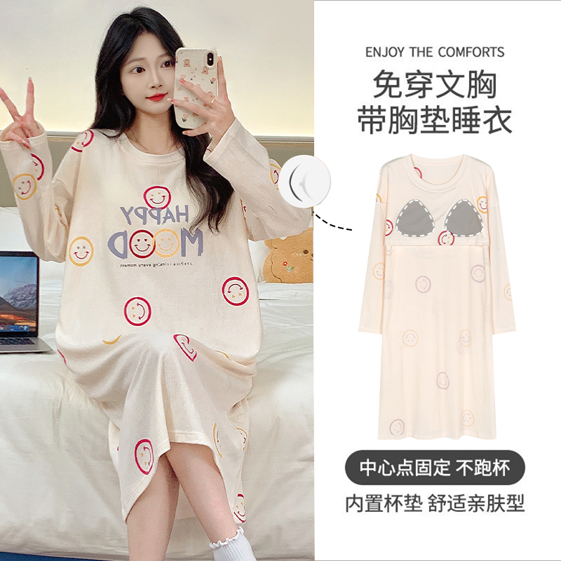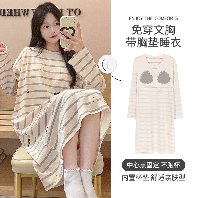 甜美可爱风连衣裙中长款 带胸垫睡裙女款 睡衣家居服 纯棉长袖 春秋季