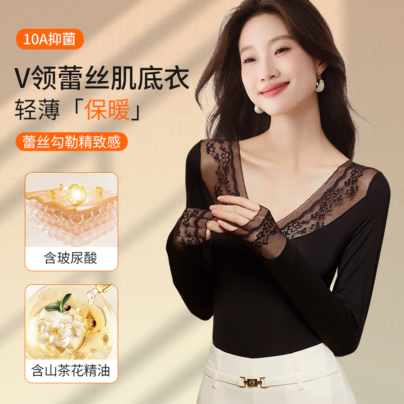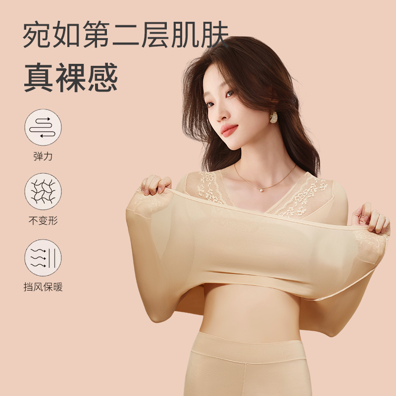 套装 超薄蕾丝V领肌底美肤衣2025新款 打底T恤保暖内衣女士秋衣秋裤