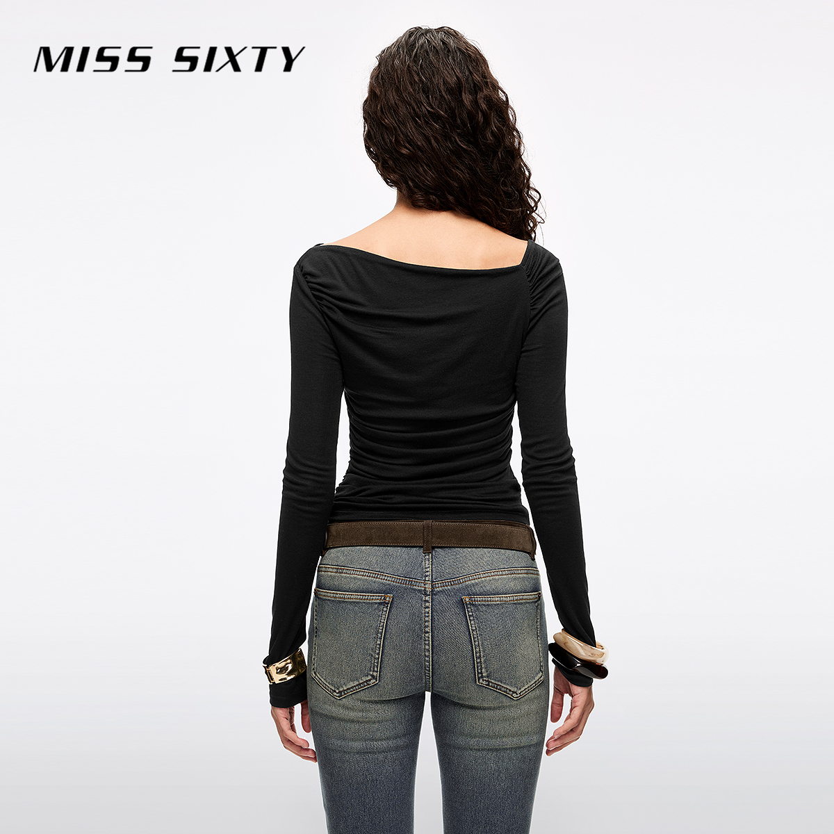 莱赛尔长袖 新款 T恤女性感不对称斜领褶皱上衣 Sixty2025冬季 Miss