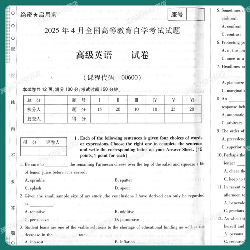 赠考点串讲掌中宝小册子 附历年真题 天一备考2025年全国高等教育自学考试函授成考 自考通全真模拟试卷 自考试卷00600高级英语