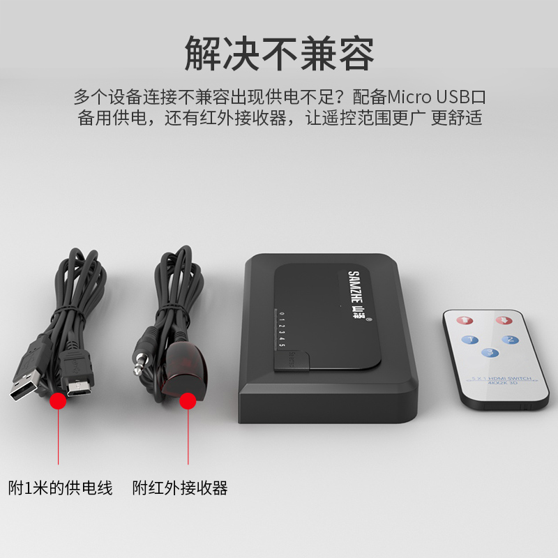山泽hdmi切换器一分三转换器四进一出分配器视频电脑屏幕HDMI高清分线器5进1出音视频高清遥控分屏器