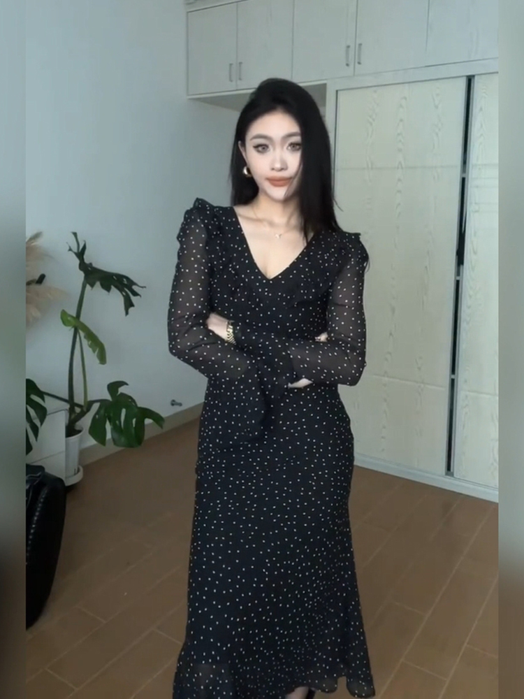 v领长袖 2025新款 显瘦休闲收腰气质短裙胖mm 碎花连衣裙女秋季 大码