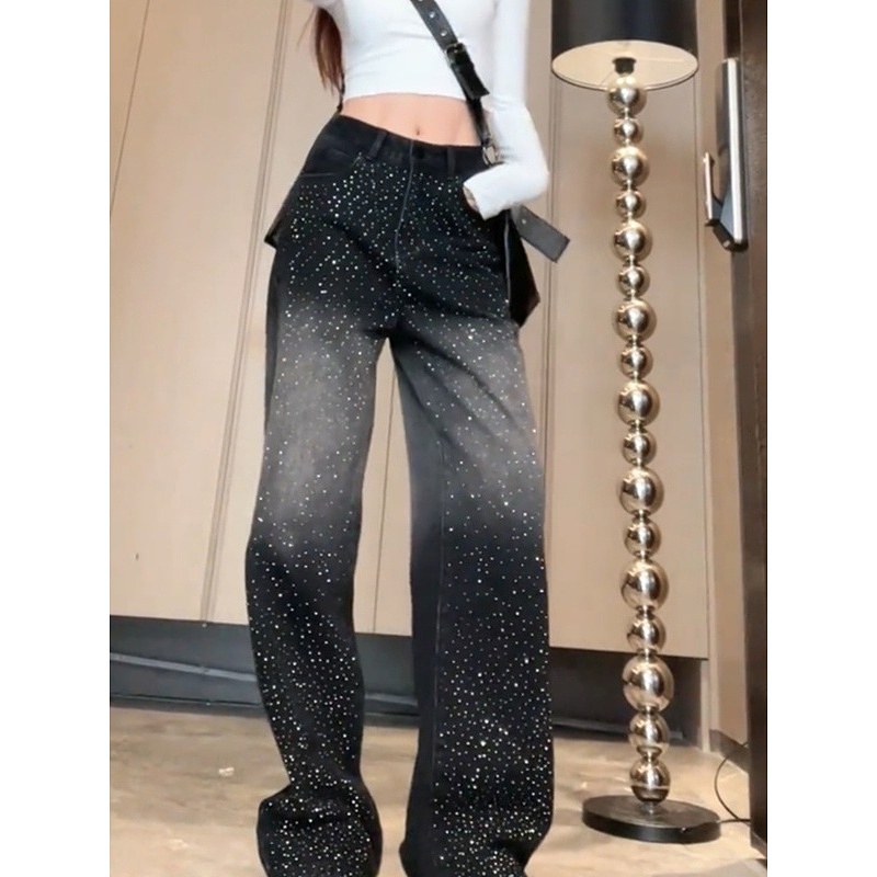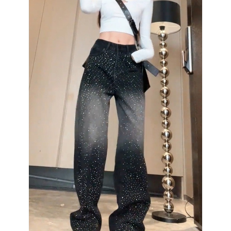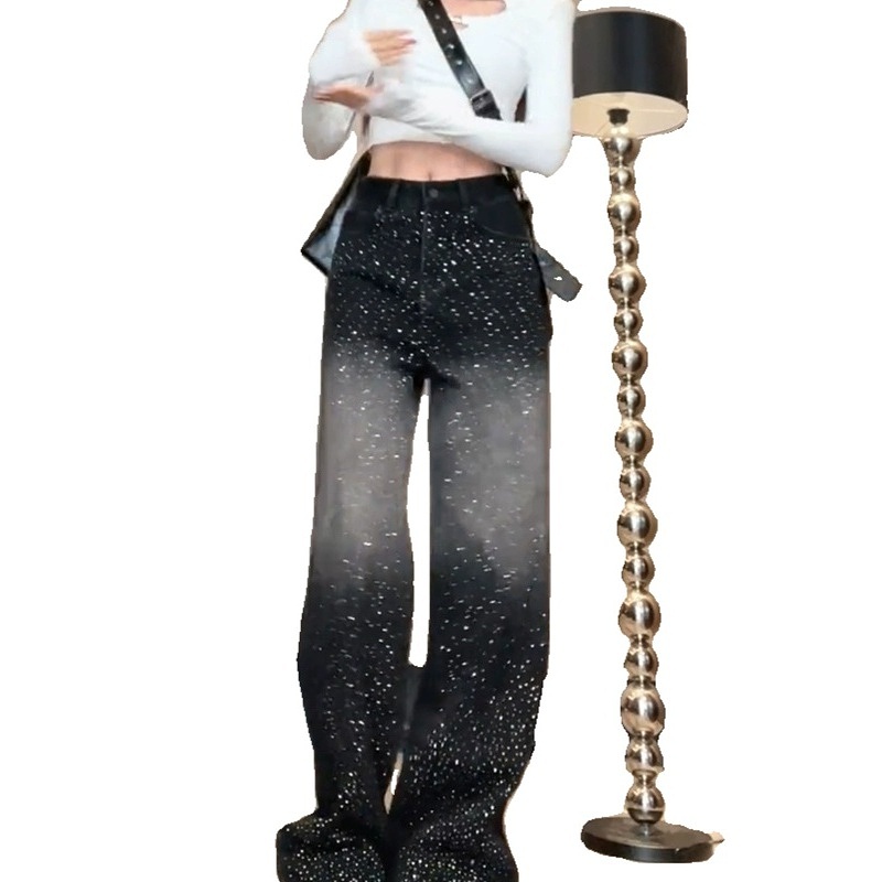 女阔腿直筒裤 长裤 2024夏季 宽松烫钻港风复古拖地裤 新款 高腰牛仔裤