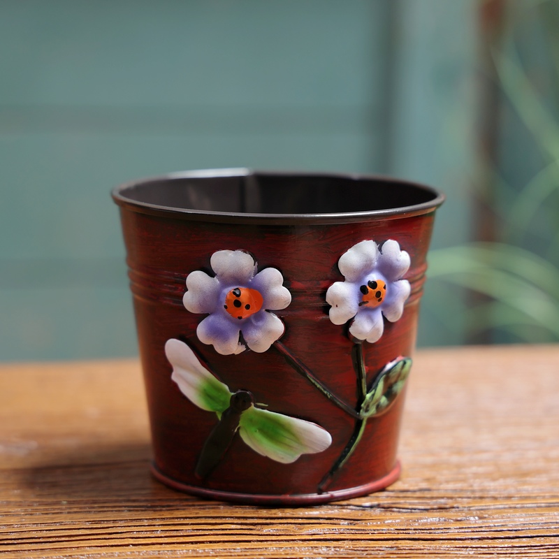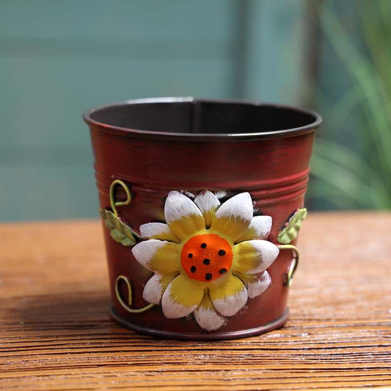 复古油画彩色立体花朵图案手工焊接装 饰铁皮桶阳台花园家居摆件