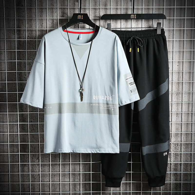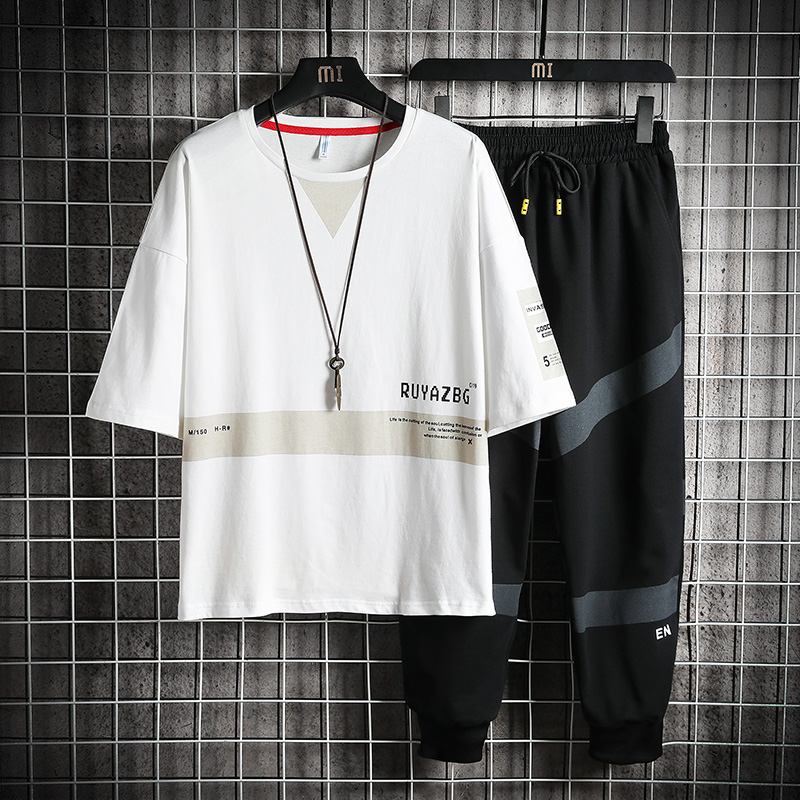 套装 夏季 上衣休闲长裤 男生宽松五分袖 潮牌印花T恤青少年潮流套装