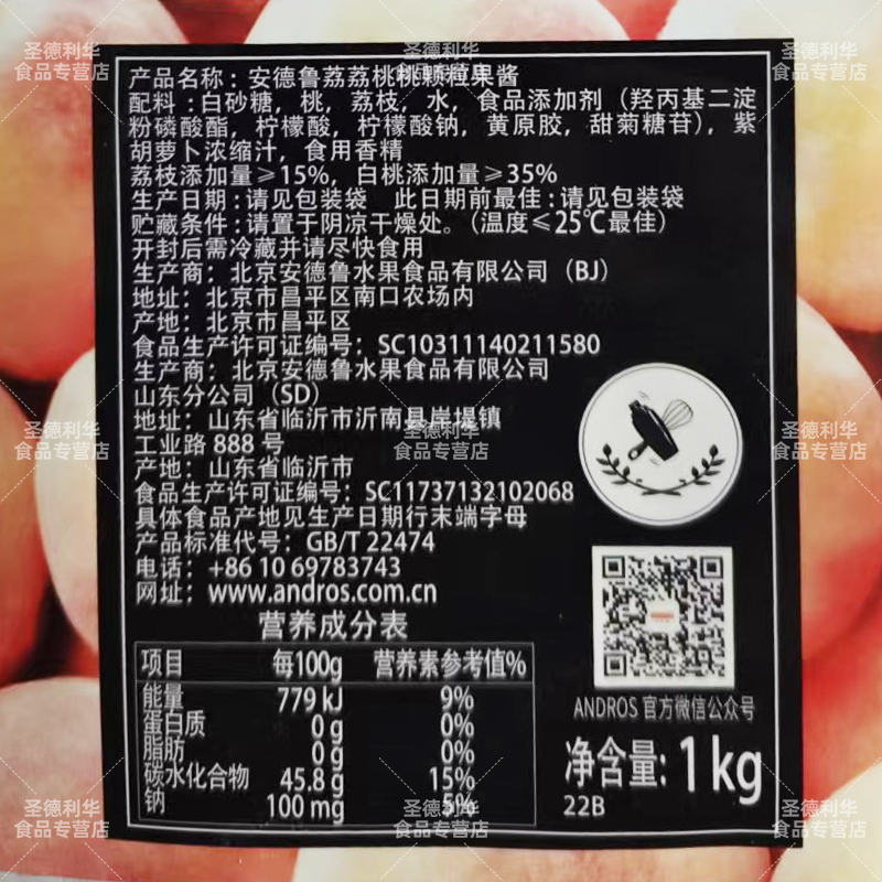 安德鲁颗粒水果酱荔荔桃桃1kg袋装 荔枝桃子奶茶冲饮烘焙夹心原料