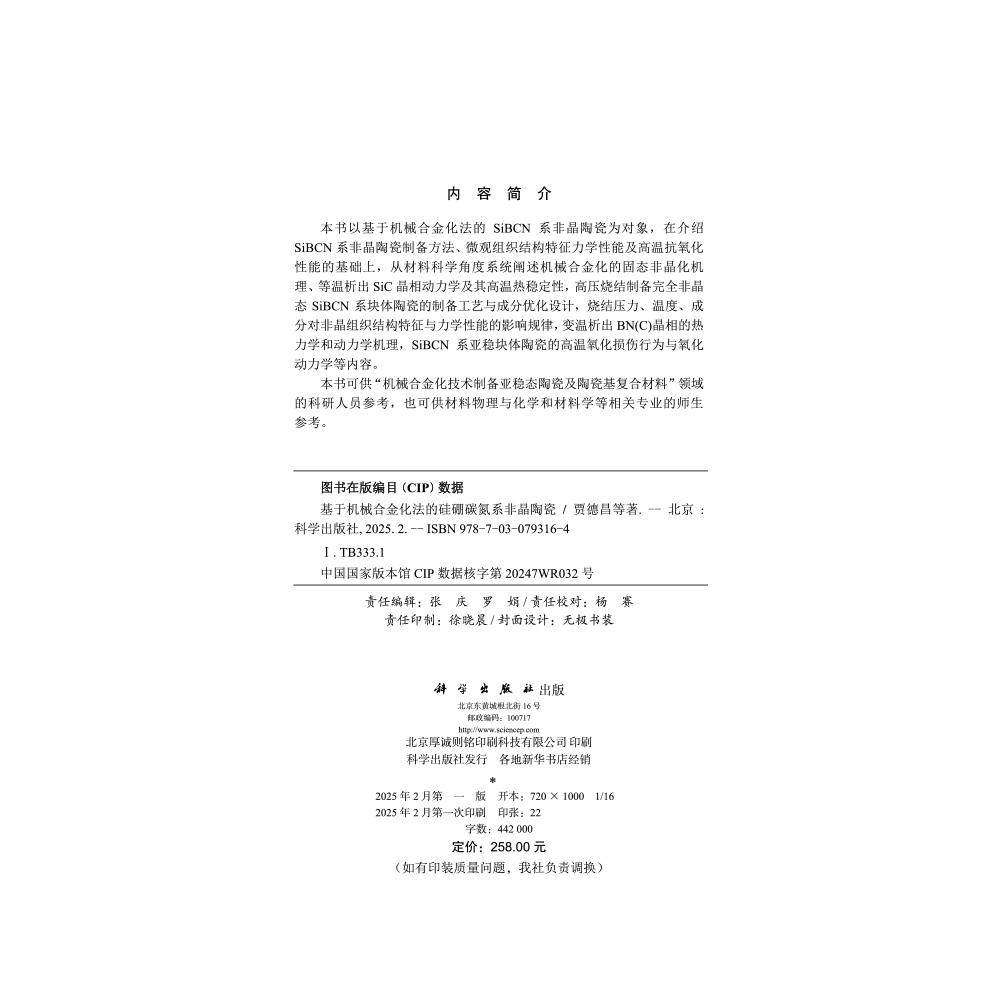科学出版 全新正版 贾德昌等 硅硼碳氮系非晶陶瓷 社 基于机械合金化法