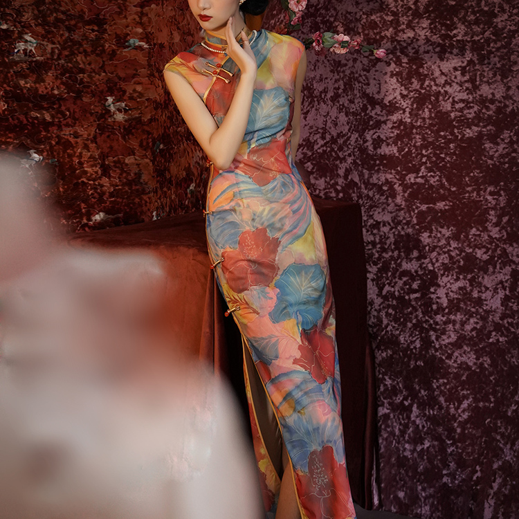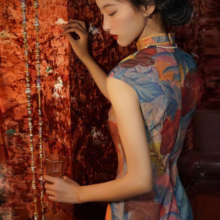 新中式 玲珑丹青 遮肚改良黑色重工鱼尾裙微胖显瘦旗袍 babes