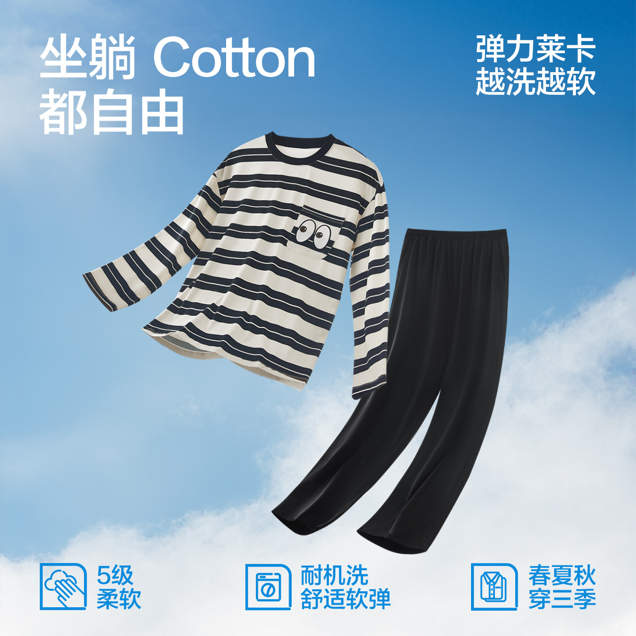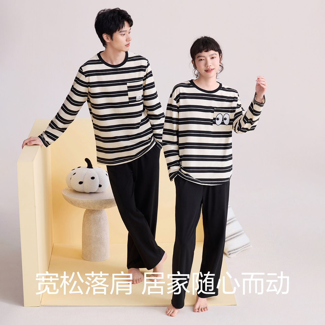 红豆居家情侣长袖 25春夏 睡衣柔软棉套头条纹休闲可外穿家居服套装