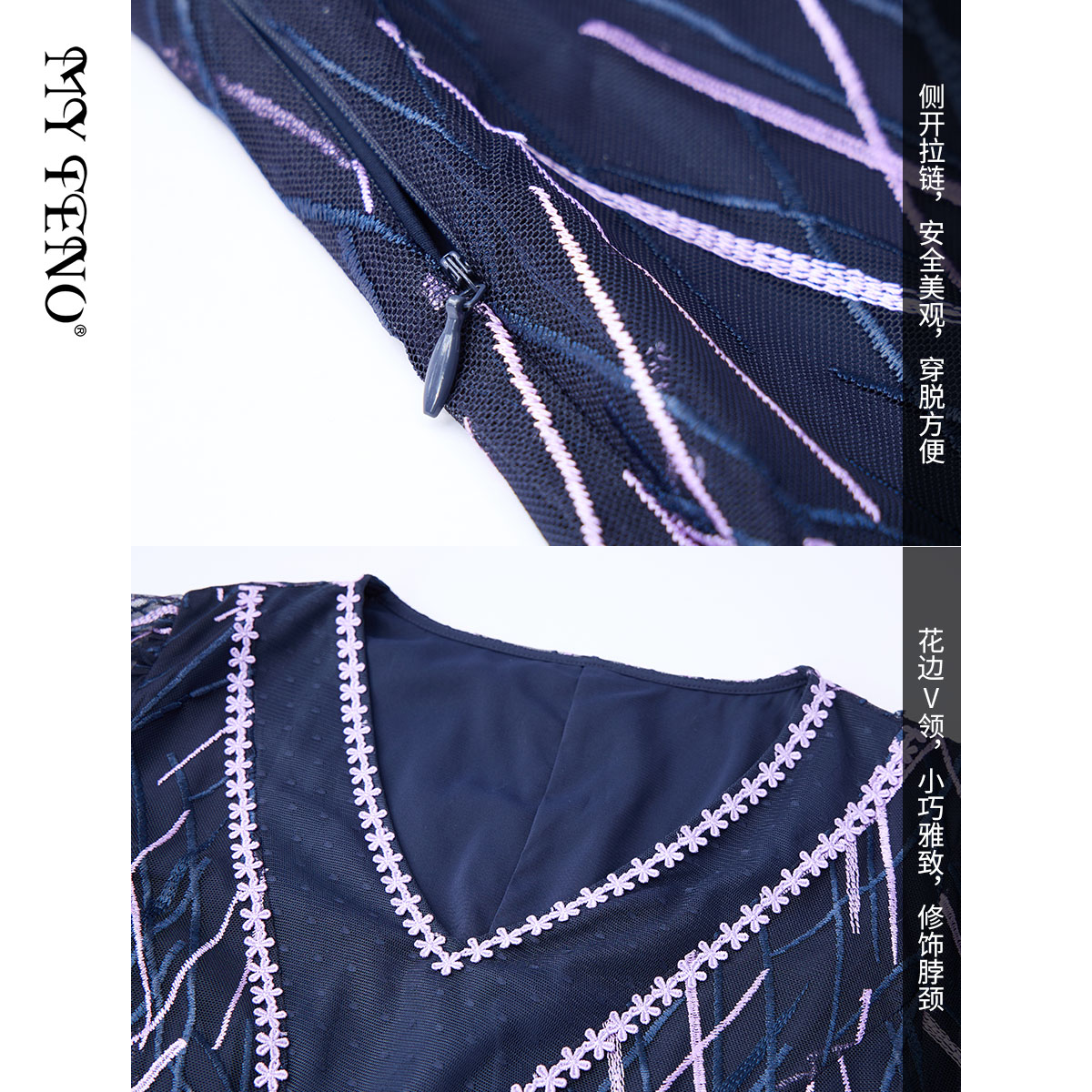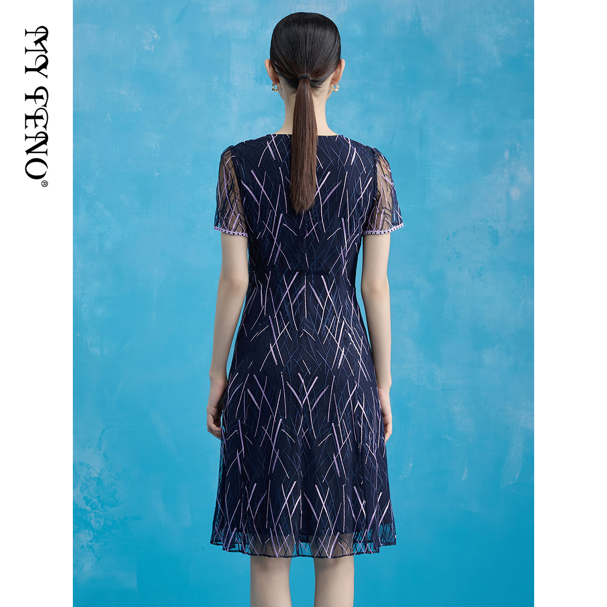 中长裙裙子 蓝色刺绣网纱连衣裙V领气质短袖 马天奴女装 春夏新款