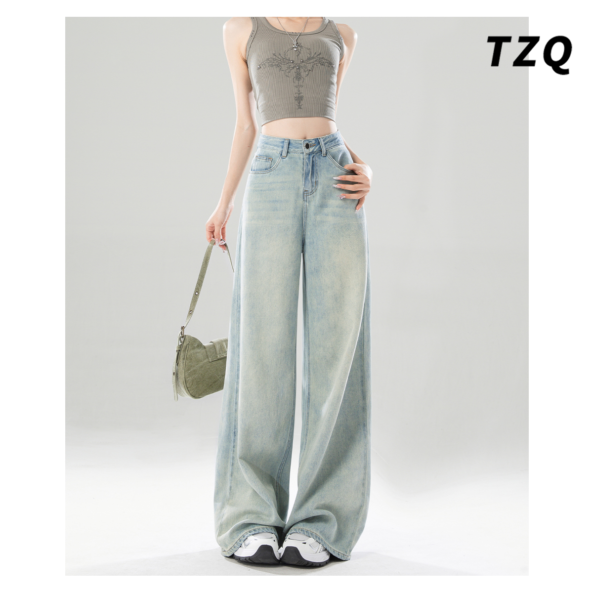 宽松显瘦垂感直筒裤 美式 新款 女2025春夏季 子 复古浅蓝色阔腿牛仔裤