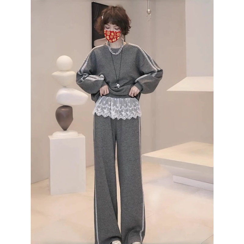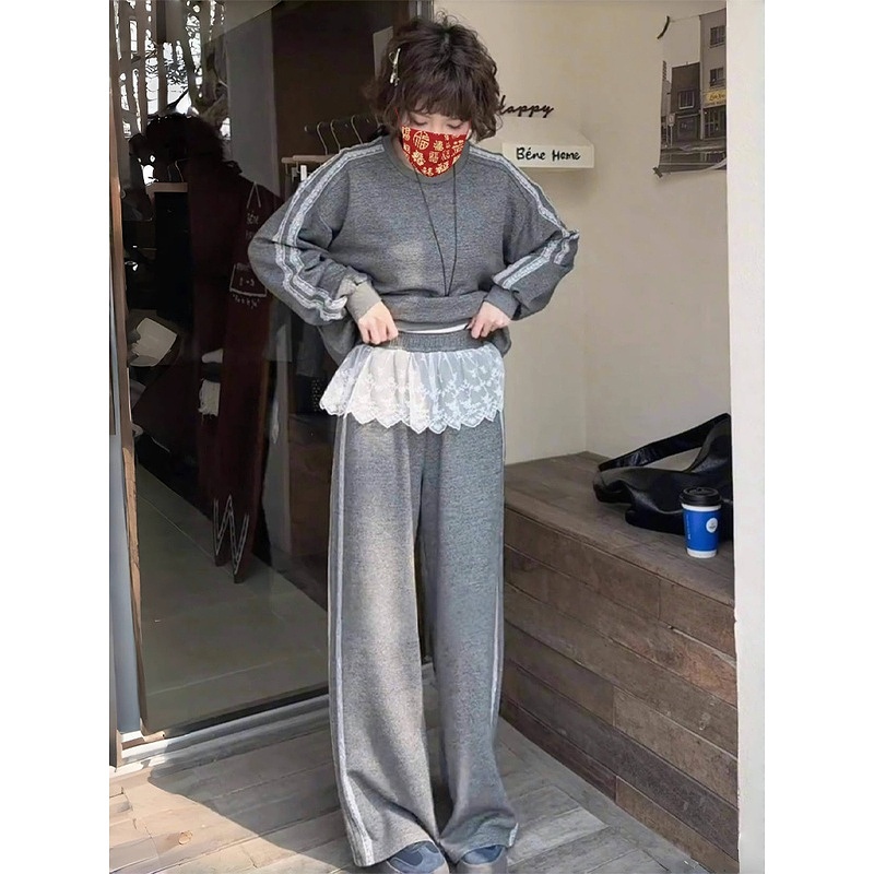 休闲蕾丝拼接卫衣阔腿裤 女2025超火韩系时尚 两件套 穿搭套装 春季