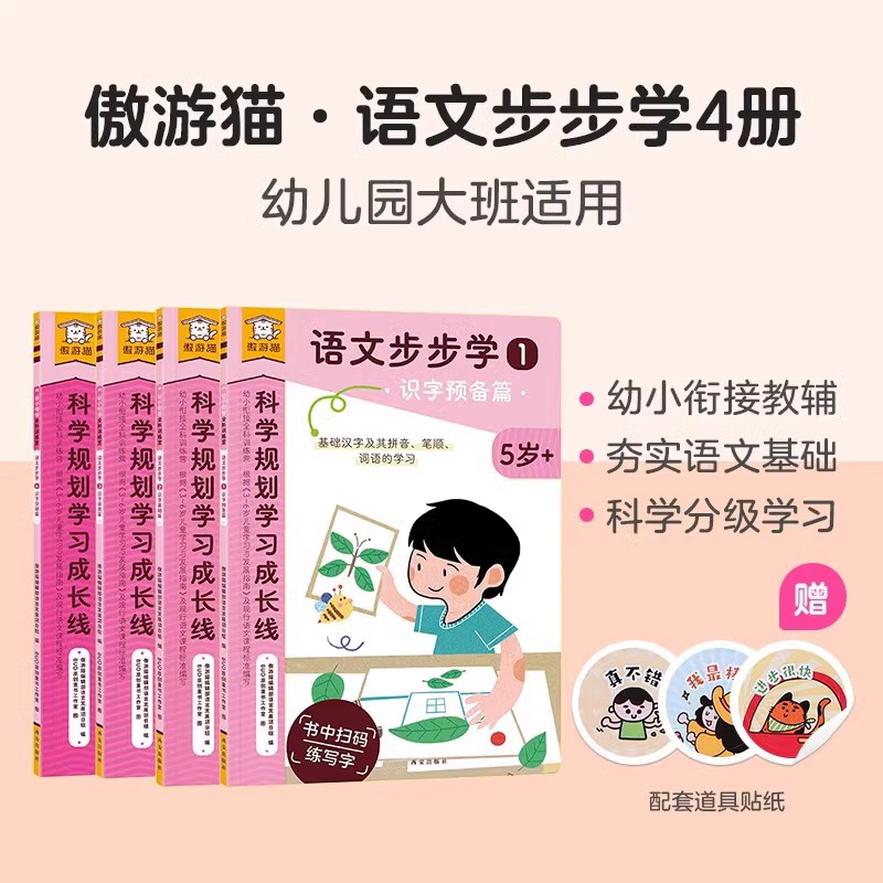 6岁儿童识字启蒙语文基础科学分级学习 傲游猫幼小衔接科训练营语文步步学套装 听音频3 扫码 凤凰新华书店旗舰店 4册幼儿园大班适用