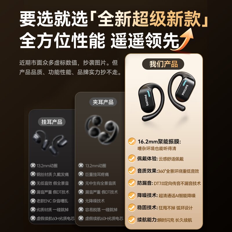 跑步运动 不入耳开放式 飞利浦蓝牙耳机无线挂耳式 气骨传导2025新款